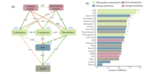 本研究综合运用中宇宙实验和15N同位素示踪技术,分析微肥对叶面氮肥的氮分配和NUE特征,并联合结构方程和随机森林模型等方法,系统考察微肥通过氮代谢、光合作用、根系发育提升NUE的关键机制和预测因子。结果显示,单独施用叶面氮肥遵循收益递减规律,氮积累、生物量和根系发育阈值出现在1%N处理。结构方程模型表明,单施氮肥主要通过调控根系发育和氮素分配影响生物量形成,而过量施氮则会抑制蒸腾作用及氮向根系转运,导致根系发育受阻。微肥配施则通过增强氮同化、光合作用与根系发育的协同,促进氮代谢过程,进而提升光合作用及NUE。随机森林分析进一步识别出光合速率、蒸腾速率、茎-15N、根-15N、根形态为微肥增效的关键预测因子。本研究证明了微肥配施叶面氮肥在优化橡胶树幼苗氮代谢和NUE的有效性和机制,为橡胶林氮素高效管理提供了理论依据。