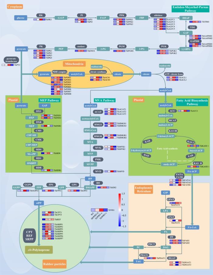 天然橡胶的主要成分为顺式-1,4-聚异戊二烯,其前体物为乙酰辅酶A和丙酮酸,这两种物质由蔗糖经一系列碳代谢反应合成。在大部分植物中,WRI1转录因子在协同调控碳代谢与脂质生物合成相关基因网络中起核心作用。